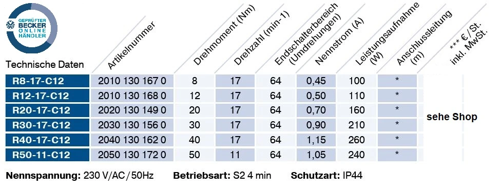 Becker - Universal-Markisenantriebe mit Funk R8-C12 bis R50-C12 , Serie R , Typ C12