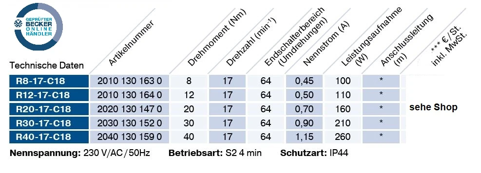 Becker - Sonnenschutzantriebe ZIP mit Funk, R7-C18 bis R40-C18 , Serie R , Typ C18