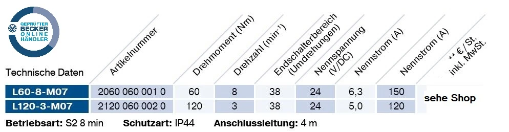 Becker - Rollläden Gleichstromantriebe mit Handkurbel - Anschluss 60-M07 bis L120-M07 , Serie L , Typ M07