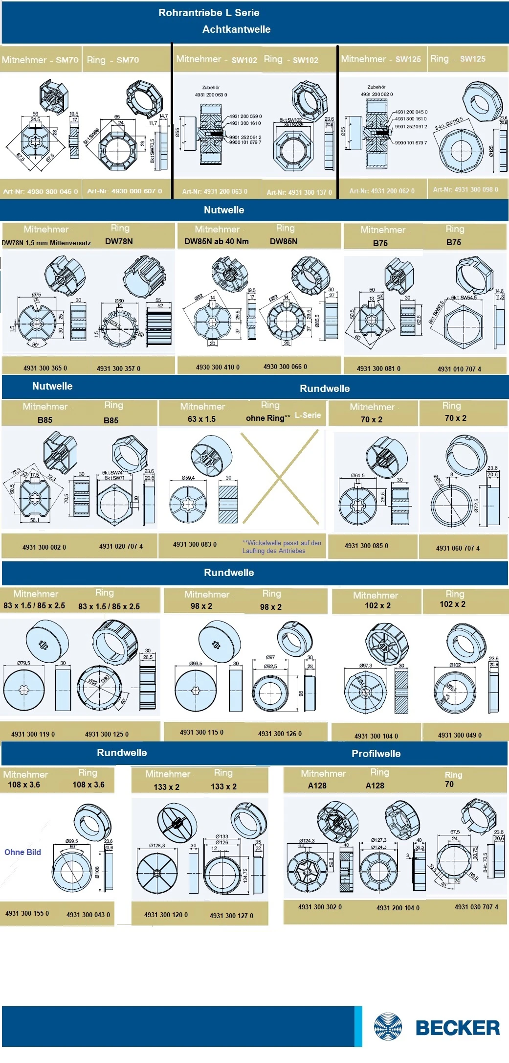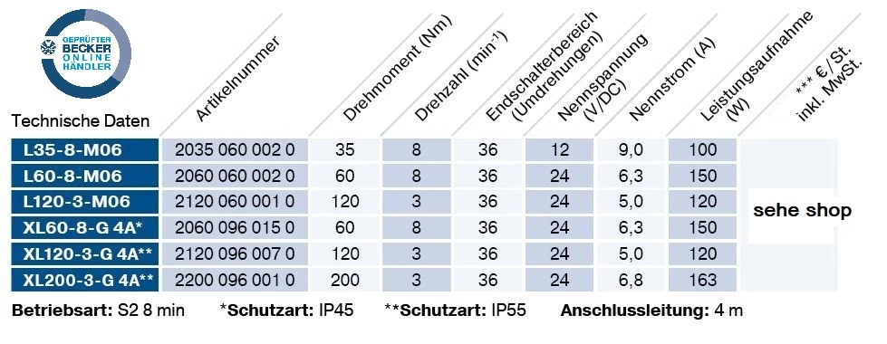 Becker - Rollläden Gleichstromantriebe  L35-M06 bis XL200-M06 Serie L bis XL, Typ M06