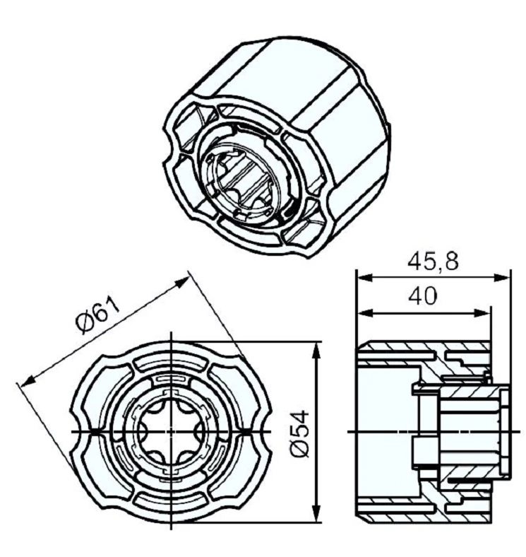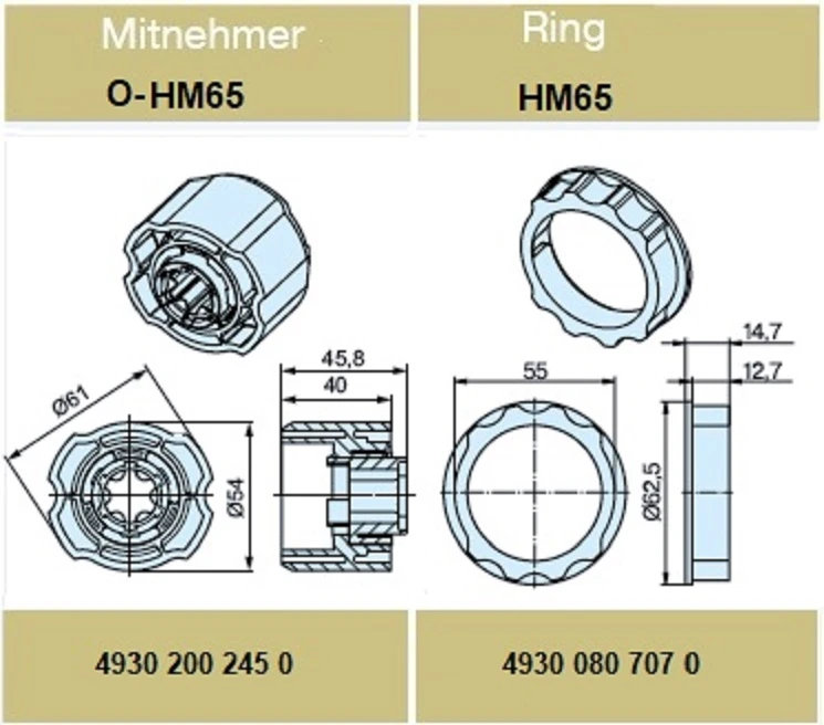 Adapterset für Profilwelle O-HM65für Rohrmotoren Becker Baureihe P und R Serie mit Hinderniserkennung  bestehend aus Mitnehmer und Ring aus Kunststoff