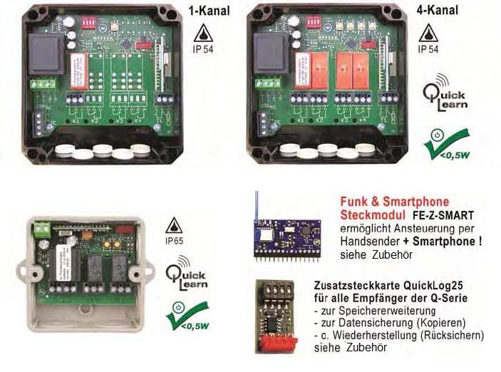 - QuickLearn Option mit Sendern der Q-Reihe (ermöglicht Fernlernen weiterer Sender ohne den direkten Zugang zum Empfänger)