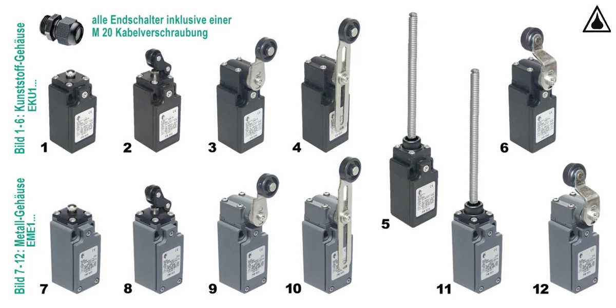 EME1-SP-KST EEndschalter mit Stößel AP, Sprungkontakt, 1 Schließer+1 Öffner, Metallgehäuse, wassergeschützt, IP 67, mit Kabelverschraubung M 20