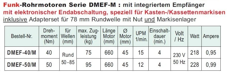 Die Rohrmotoren der Serie DMEF-M verfügen über einen integrierten 433 MHz. Funkempfänger, der eine kabellose Bedienung mittels einer Vielzahl von Funksendern (Handsender, Wandsender, Sonne-Wind Funkstation) ermöglicht. Es können max. 20 Sender bzw. Kanäle eingelernt werden. Weiterhin sind diese Motoren mit einer elektronischen Endabschaltung ausgestattet. Die Einstellung bzw. Programmierung der Endlagen erfolgt schnell und komfortabel über einen Funksender ohne Zugriff auf den Motorkopf. Die untere Endlage (Abschaltung nach dem Ausfahren der Markise) wird als fester Punkt eingestellt, die obere Endlage (Abschaltung nach dem Einfahren der Markise) erfolgt automatisch auf Anschlag im Markisenkasten durch Drehmomenterkennung.