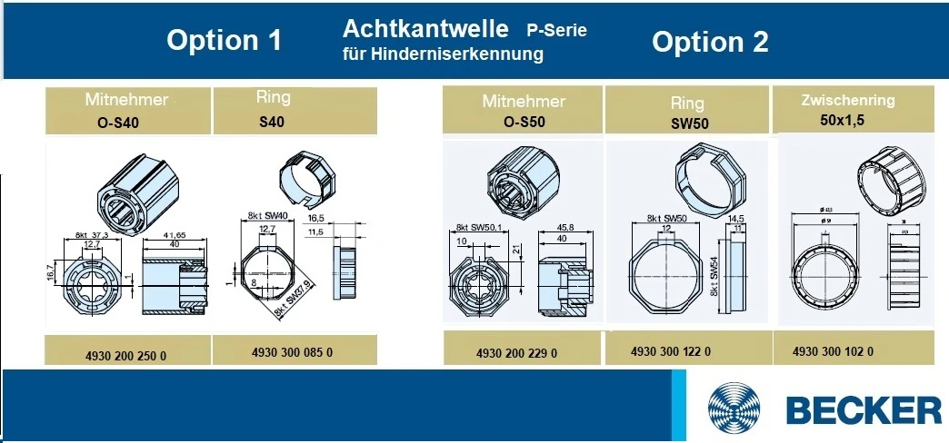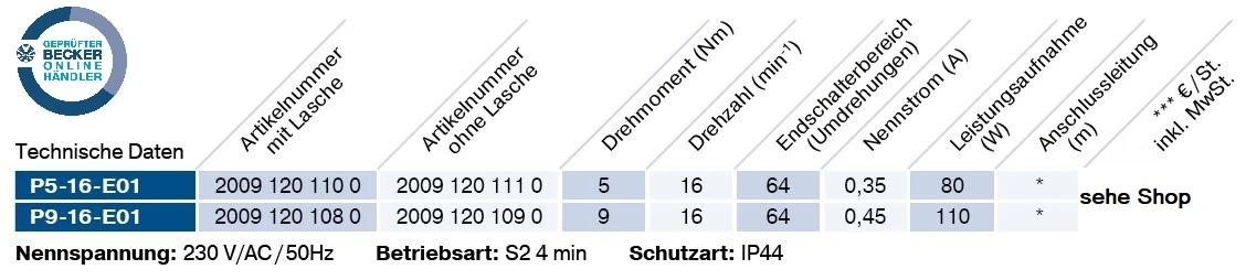 Becker - Rollladenantriebe P5-E01 bis P9-E01 Serie P, Typ E01 mit elektronischer Endabschaltung