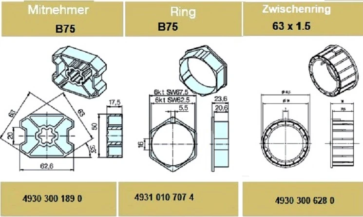 Adapterset bestehend aus Mitnehmer und Ring + Zwischenring 63x1,5 aus Kunststoff .