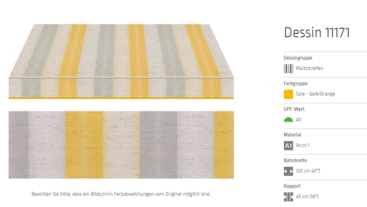 Bei allen Markisenstoffen können Unregelmäßigkeiten in der Oberflächenbeschaffenheit auftreten.