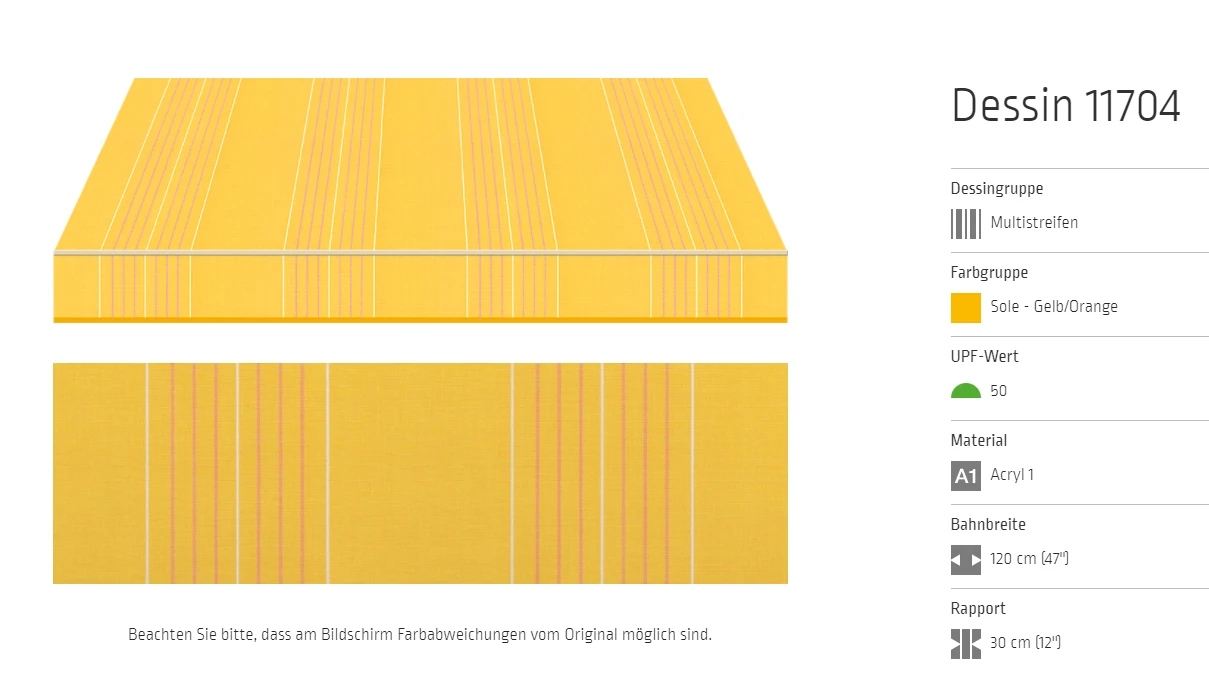 Bei allen Markisenstoffen können Unregelmäßigkeiten in der Oberflächenbeschaffenheit auftreten.