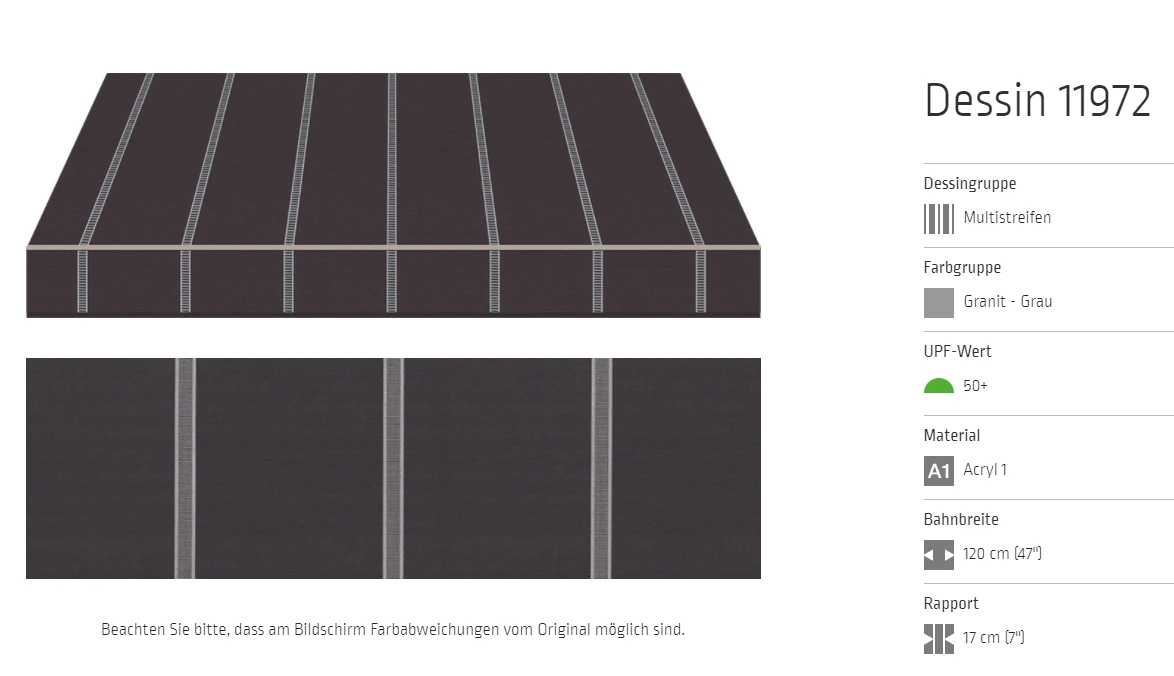 Bei allen Markisenstoffen können Unregelmäßigkeiten in der Oberflächenbeschaffenheit auftreten.