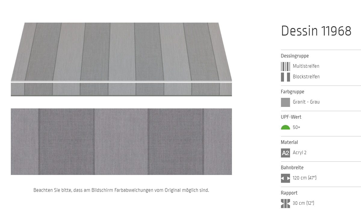 Bei allen Markisenstoffen können Unregelmäßigkeiten in der Oberflächenbeschaffenheit auftreten.