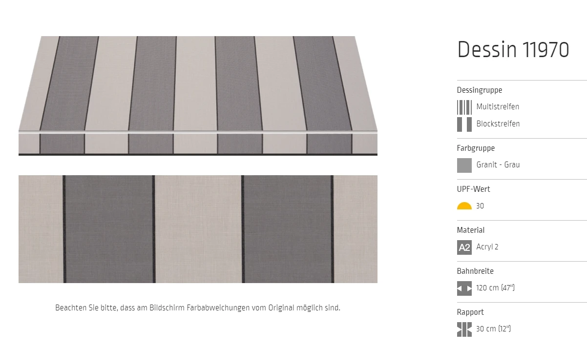 Bei allen Markisenstoffen können Unregelmäßigkeiten in der Oberflächenbeschaffenheit auftreten.