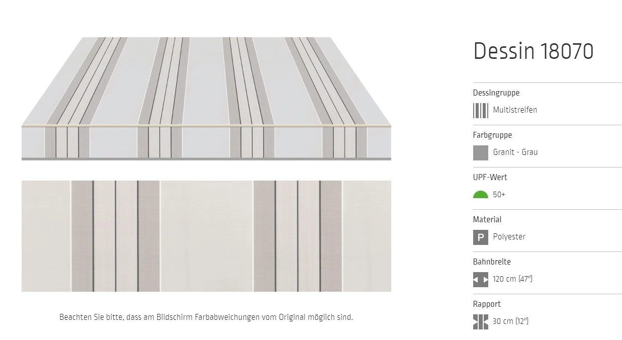 Bei allen Markisenstoffen können Unregelmäßigkeiten in der Oberflächenbeschaffenheit auftreten.
