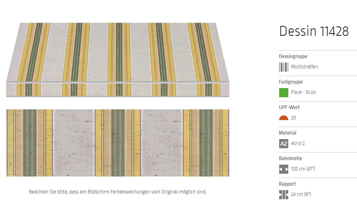 Bei allen Markisenstoffen können Unregelmäßigkeiten in der Oberflächenbeschaffenheit auftreten.