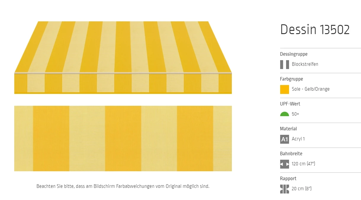 Bei allen Markisenstoffen können Unregelmäßigkeiten in der Oberflächenbeschaffenheit auftreten.