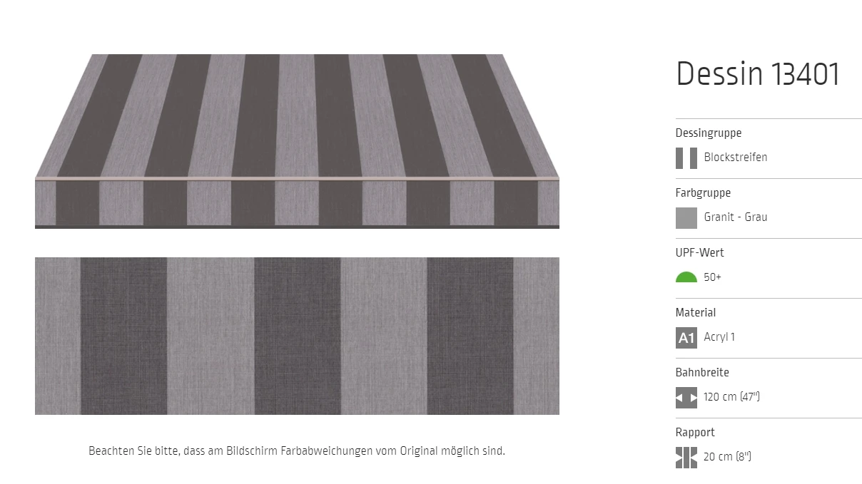 Bei allen Markisenstoffen können Unregelmäßigkeiten in der Oberflächenbeschaffenheit auftreten.