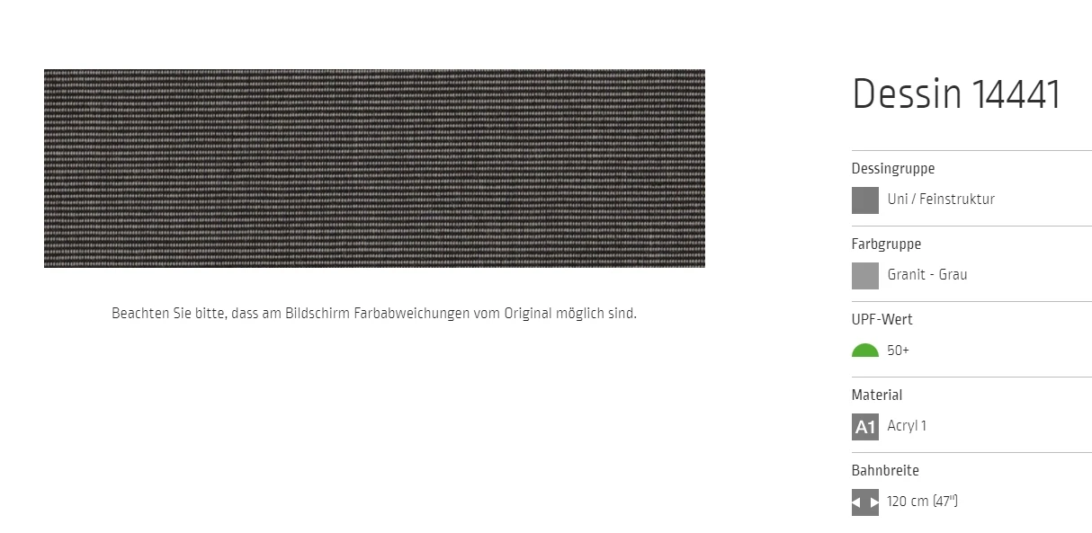 Bei allen Markisenstoffen können Unregelmäßigkeiten in der Oberflächenbeschaffenheit auftreten.