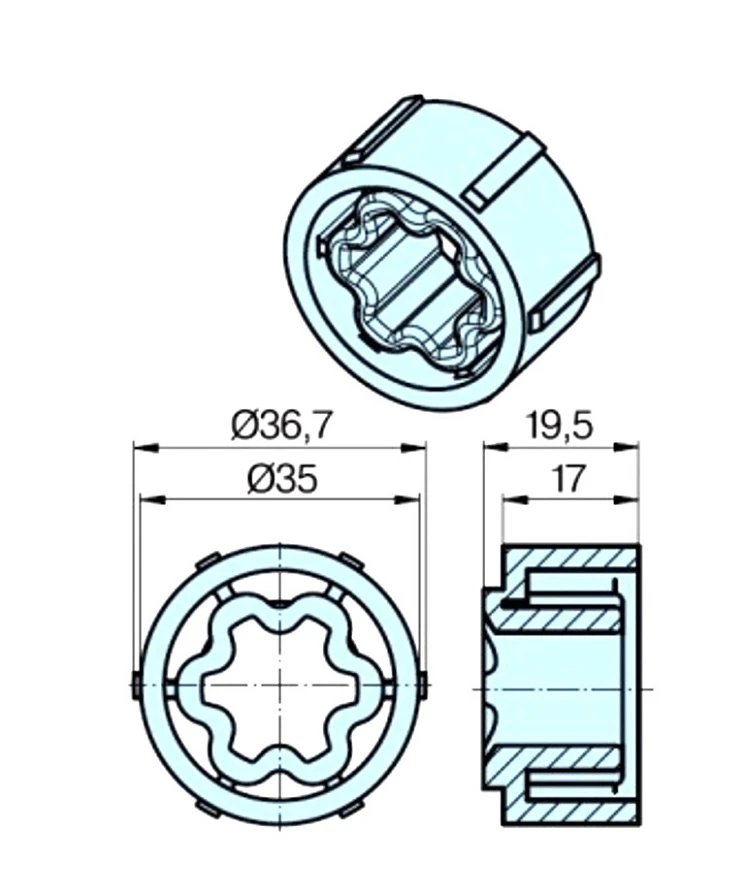 Bestehend aus Mitnehmer und Ring aus Kunststoff.