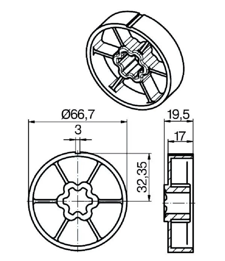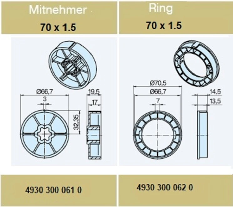 Adapterset Bestehend aus Mitnehmer und Ring aus Kunststoff . Für Becker Rohrantriebe der Baureihe R7 bis R50 .