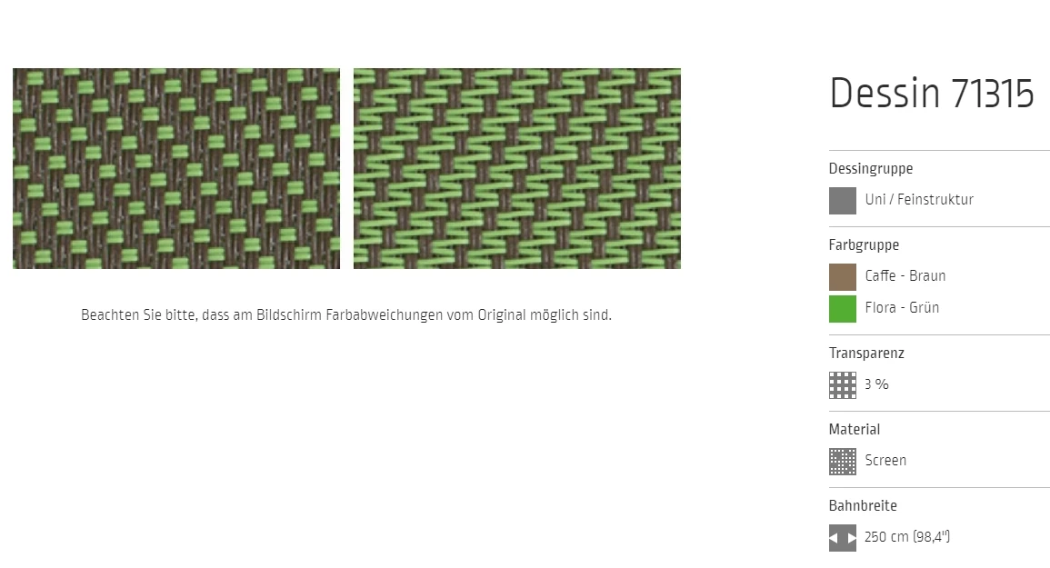 Markisentuch Screen-Gewebe Uni - Feinstruktur, Caffe - Braun / Flora - Grün Transparenz 3 Prozent