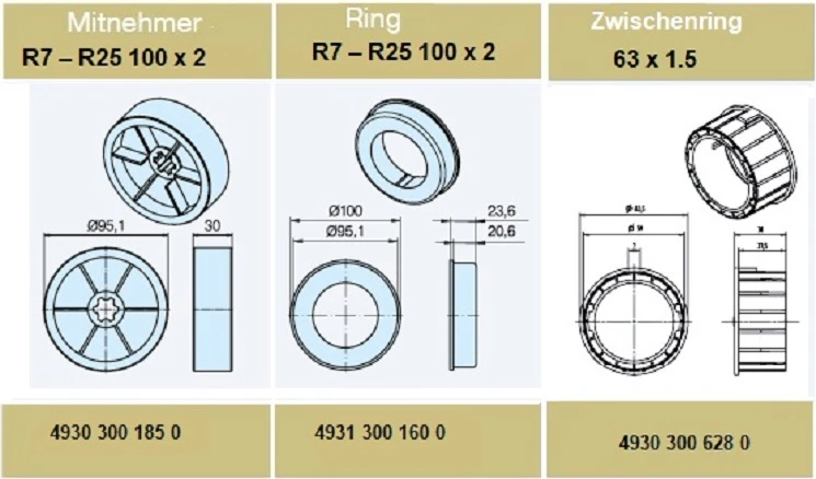 Adapterset Bestehend aus Mitnehmer , Ring und Zwischenring aus Kunststoff . Für Becker Rohrantriebe der Baureihe R7 - R25 .