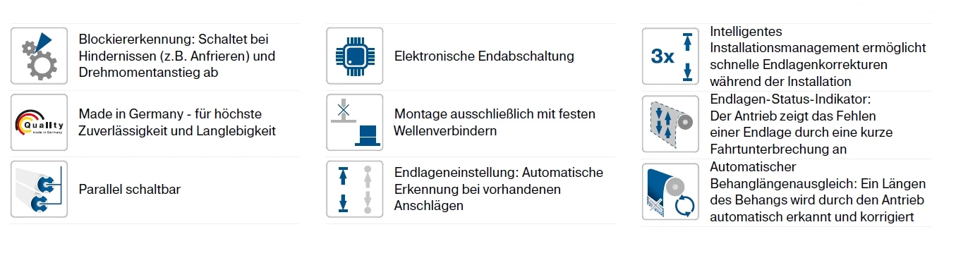 • Automatischer Behanglängenausgleich: Ein Längen des Behangs wird durch den Antrieb automatisch erkannt und korrigiert.