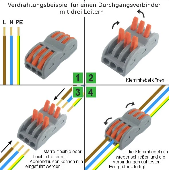 • Für alle Leiterarten: ein-, fein- oder mehrdrähtig bzw. starr/flexibel