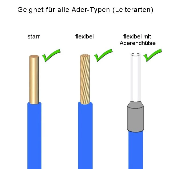 • Für alle Leiterarten: ein-, fein- oder mehrdrähtig bzw. starr/flexibel