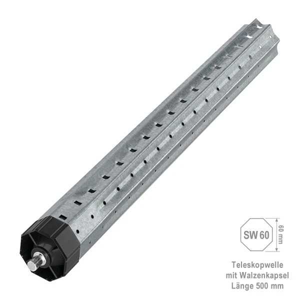 Teleskopwelle SW 60, Länge 500 mm, aus feuerverzinktem Stahl, für Achtkantwelle SW 60, montiert mit Walzenkapsel