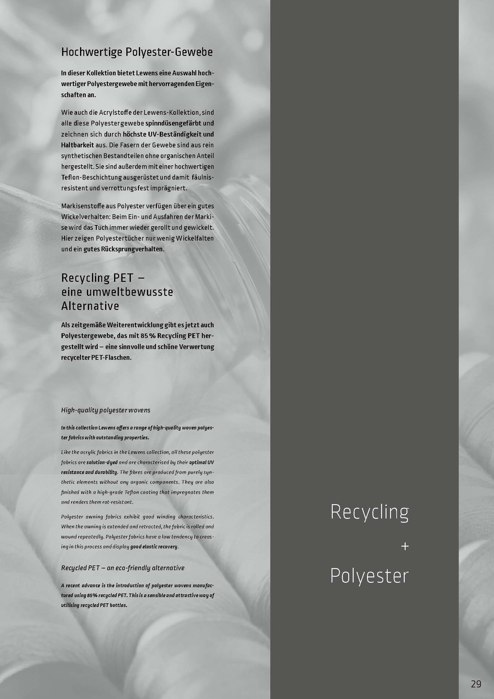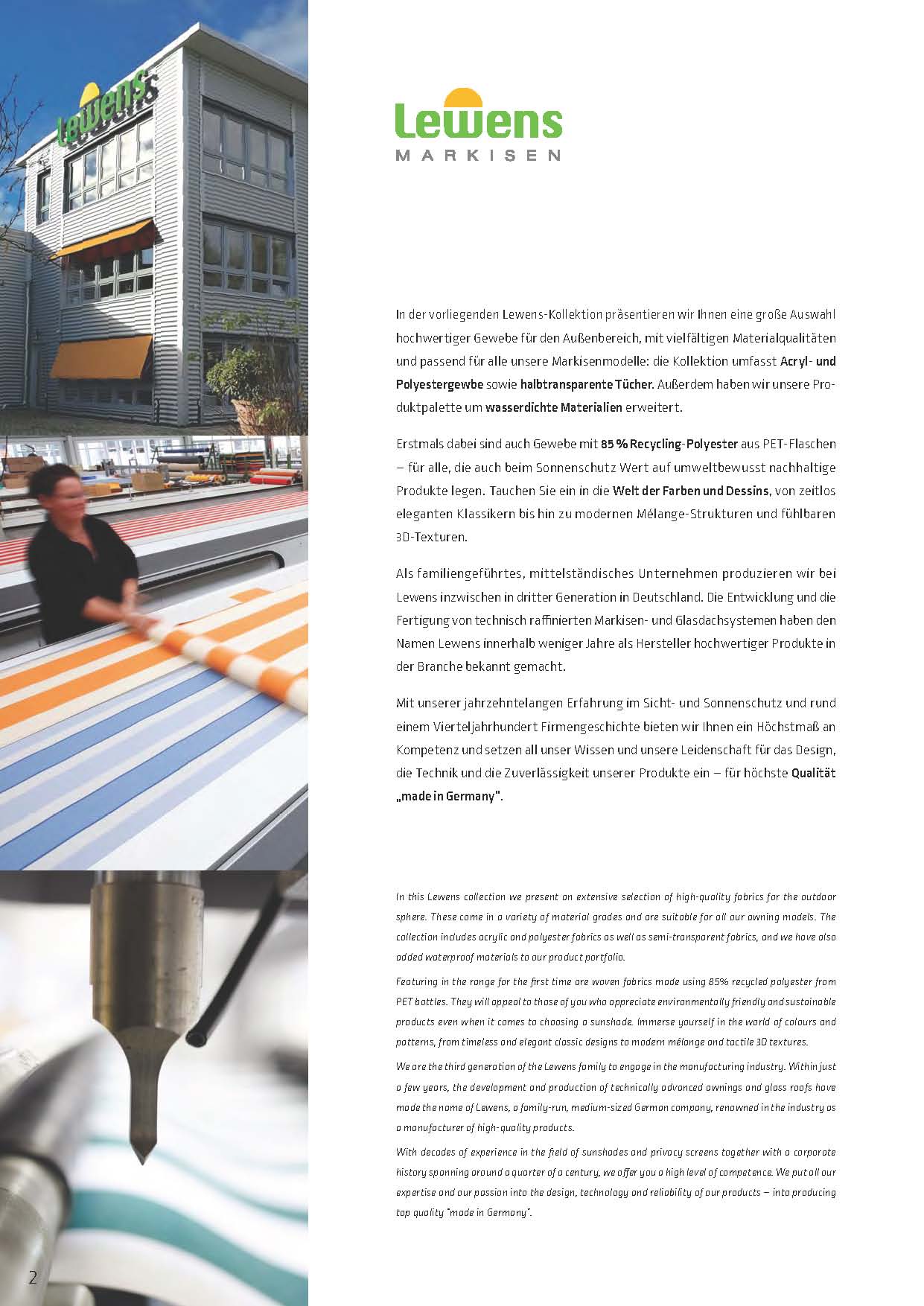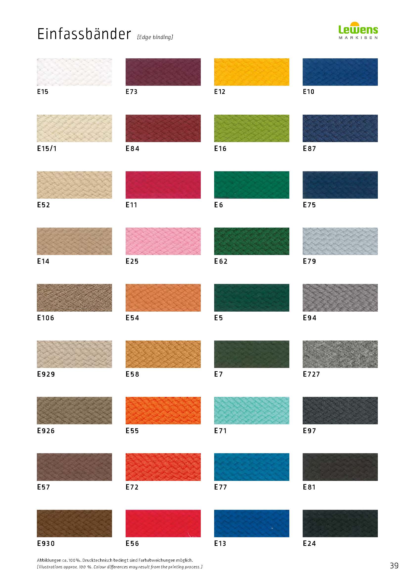 Ob Sie leuchtende Kontraste zwischen Tuch und Gestell oder eine dezente Farbkomposition „Ton in Ton“ bevorzugen, Vintage- oder Natur-Look mit strukturierten Oberflächen, coolen Glanz mit Lounge-Atmosphäre oder knallige Pop-Art – die Stoffe und Gestellfarben von LEWENS bieten Ihnen grenzenlose Gestaltungsmöglichkeiten.