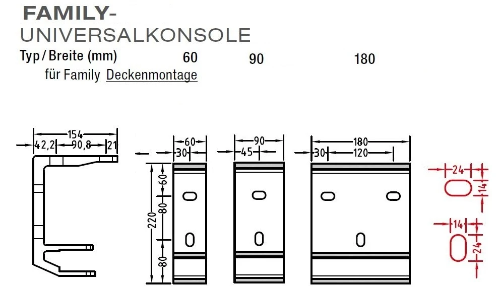 Es stehen zur Auswahl von Breiten  60mm , 90mm  und 180mm , für 40 x 40 mm Konsolrohr