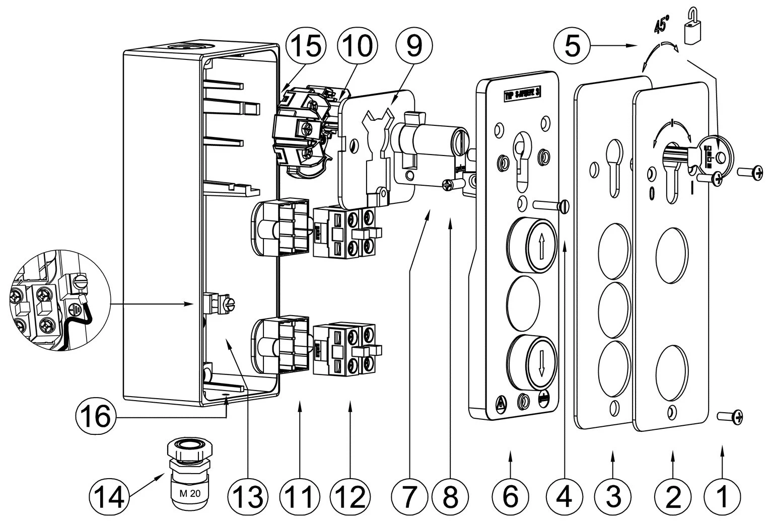 WTS - Standard - Schlüsseltaster mit 1 Tast-Kontakt mit Schlüssel : AUF Drucktasten: STOP - AB , UP ,Wassergeschützt - Schutzart IP 54