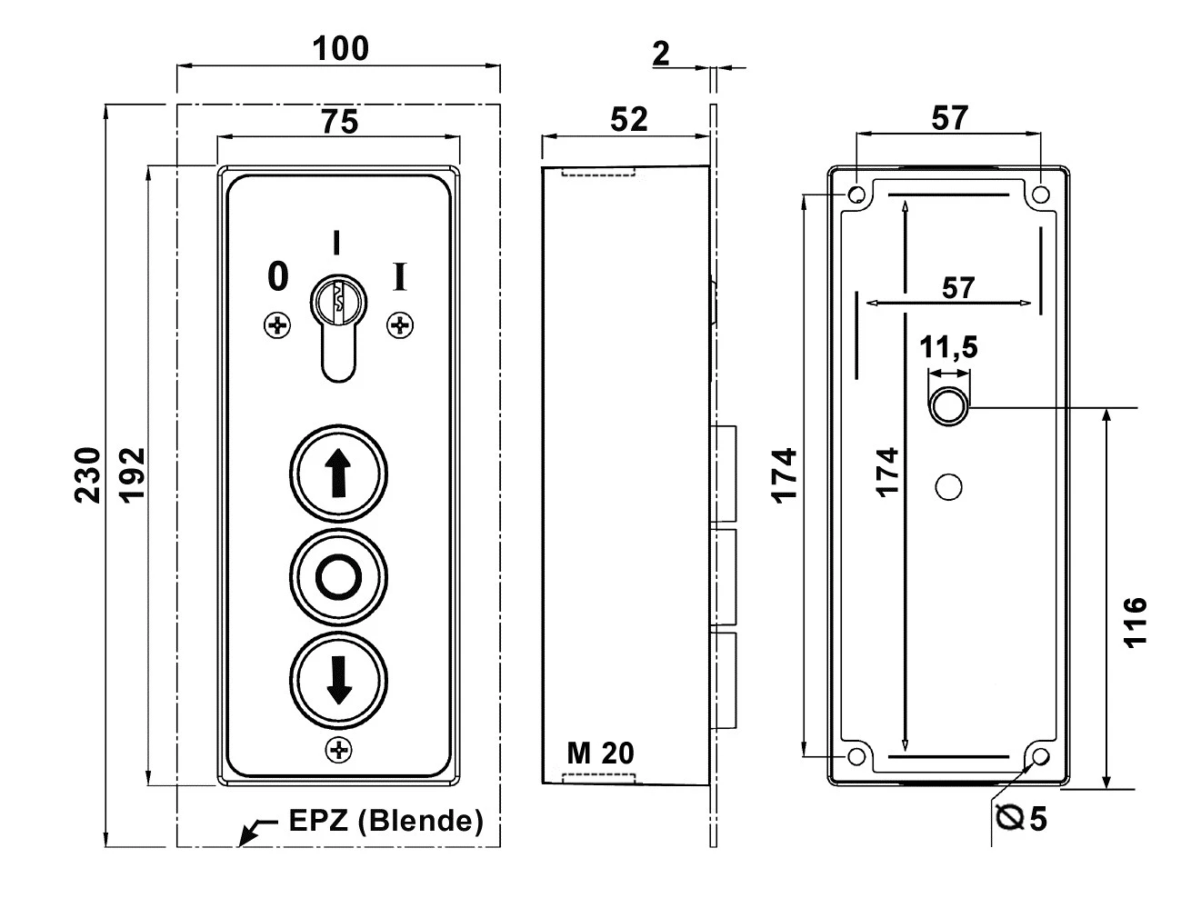 Schlüssel : Ein/Aus Drucktasten: AUF/NOT-HALT/AB, UP Wassergeschützt - Schutzart IP 54