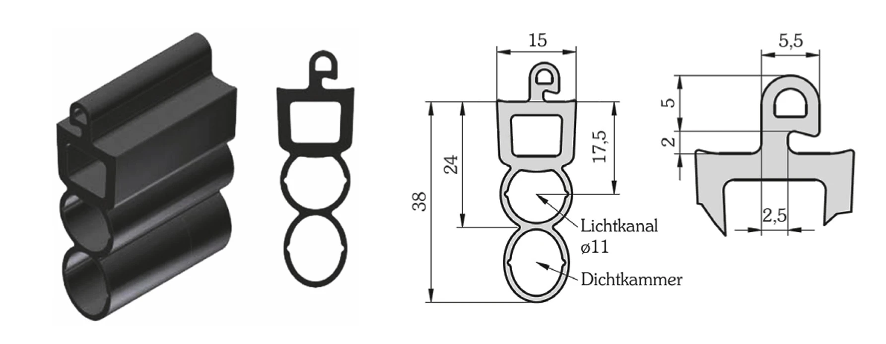 WTS - Gummiprofil für Opto-Sensoren, mit Dichtkammer, für 55/77mm Rollladen-/Rolltorprofile, mit Profil-Nut 5,5mm