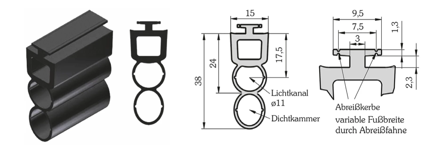 WTS - Gummiprofil für Opto-Sensoren, mit Dichtkammer, für 55/77mm Rollladen-/Rolltorprofile, mit T-Nut 9,5/7,5mm