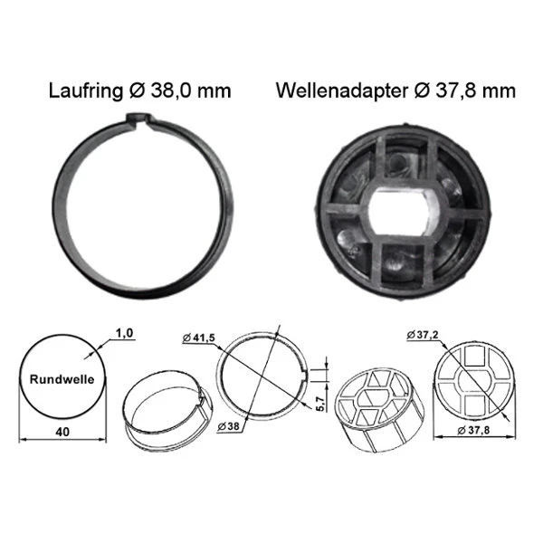 Adapterset für 40 mm Rundwelle, geeignet für Wellenstärke 1,0 mm, Adapter+Mitnehmer