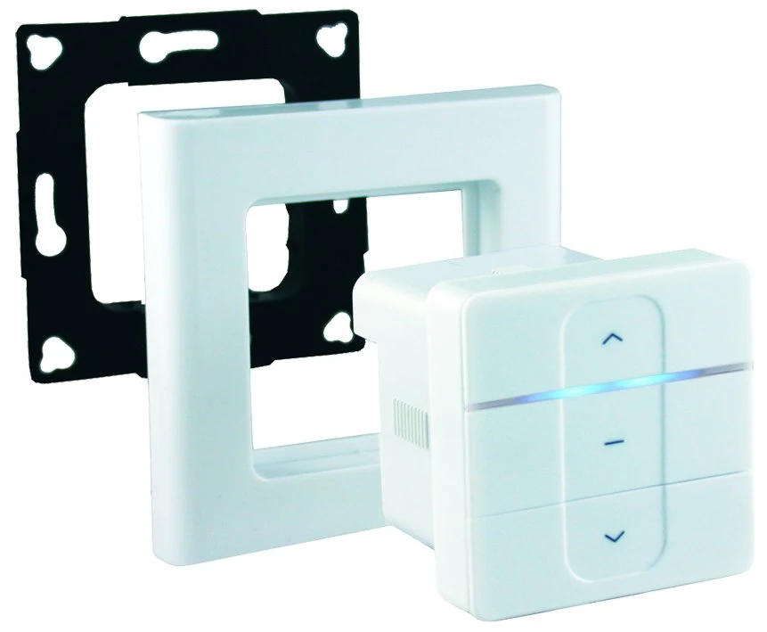 Mit einem entsprechenden DIN-Zwischenrahmen passt die Steuerung in nahezu alle handelsüblichen Schalterprogramme (z.B. BERKER, BUSCH-JAEGER, GIRA, JUNG, KOPP und MERTEN)