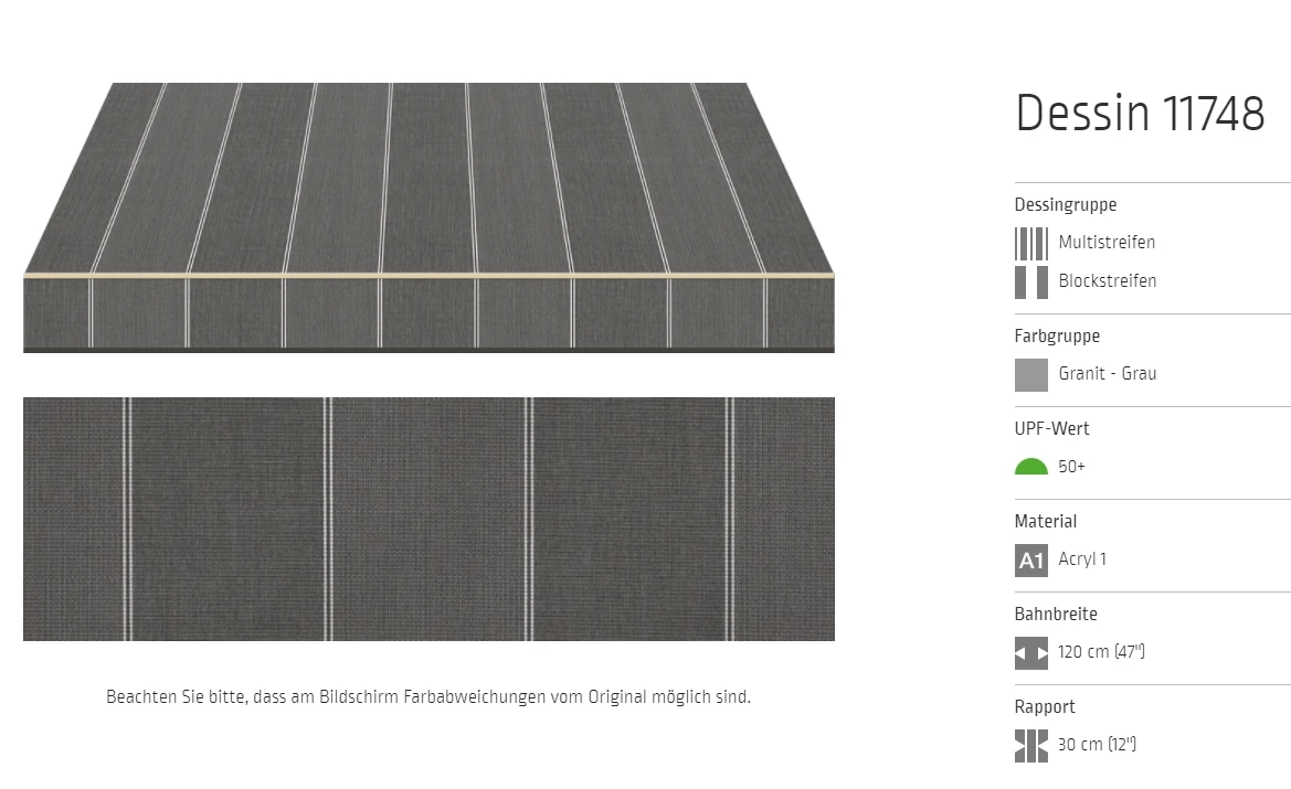Bei allen Markisenstoffen können Unregelmäßigkeiten in der Oberflächenbeschaffenheit auftreten.