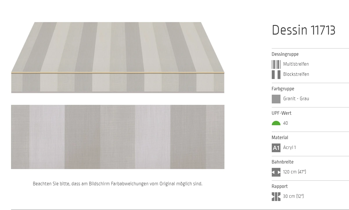 Bei allen Markisenstoffen können Unregelmäßigkeiten in der Oberflächenbeschaffenheit auftreten.