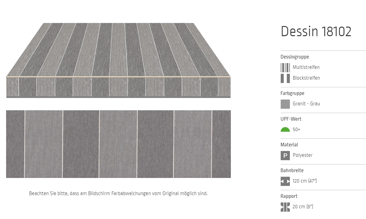 Bei allen Markisenstoffen können Unregelmäßigkeiten in der Oberflächenbeschaffenheit auftreten.
