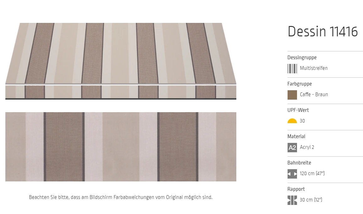 Bei allen Markisenstoffen können Unregelmäßigkeiten in der Oberflächenbeschaffenheit auftreten.