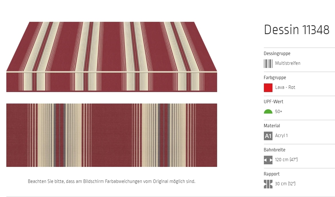 Bei allen Markisenstoffen können Unregelmäßigkeiten in der Oberflächenbeschaffenheit auftreten.
