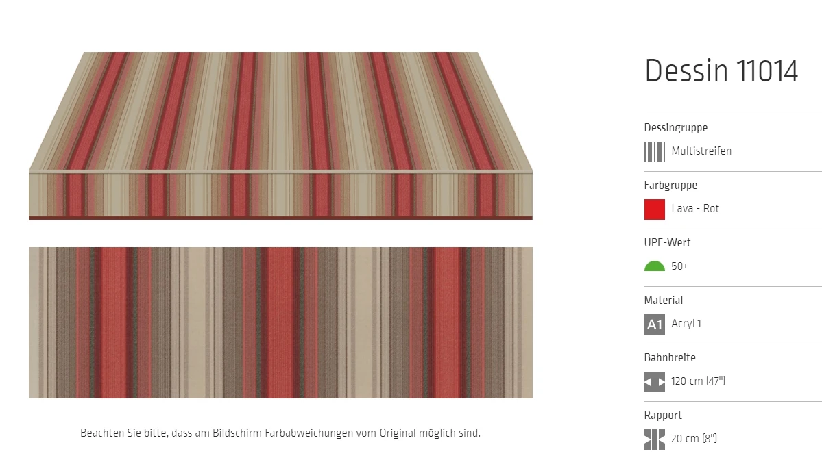 Bei allen Markisenstoffen können Unregelmäßigkeiten in der Oberflächenbeschaffenheit auftreten.