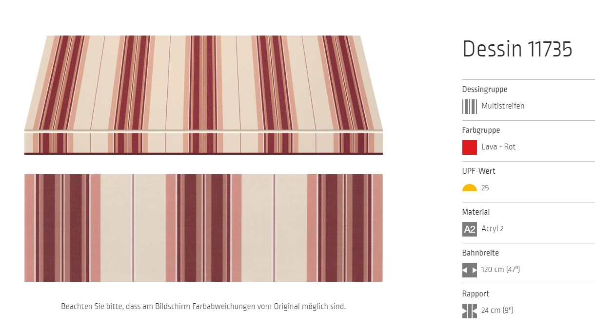 Bei allen Markisenstoffen können Unregelmäßigkeiten in der Oberflächenbeschaffenheit auftreten.
