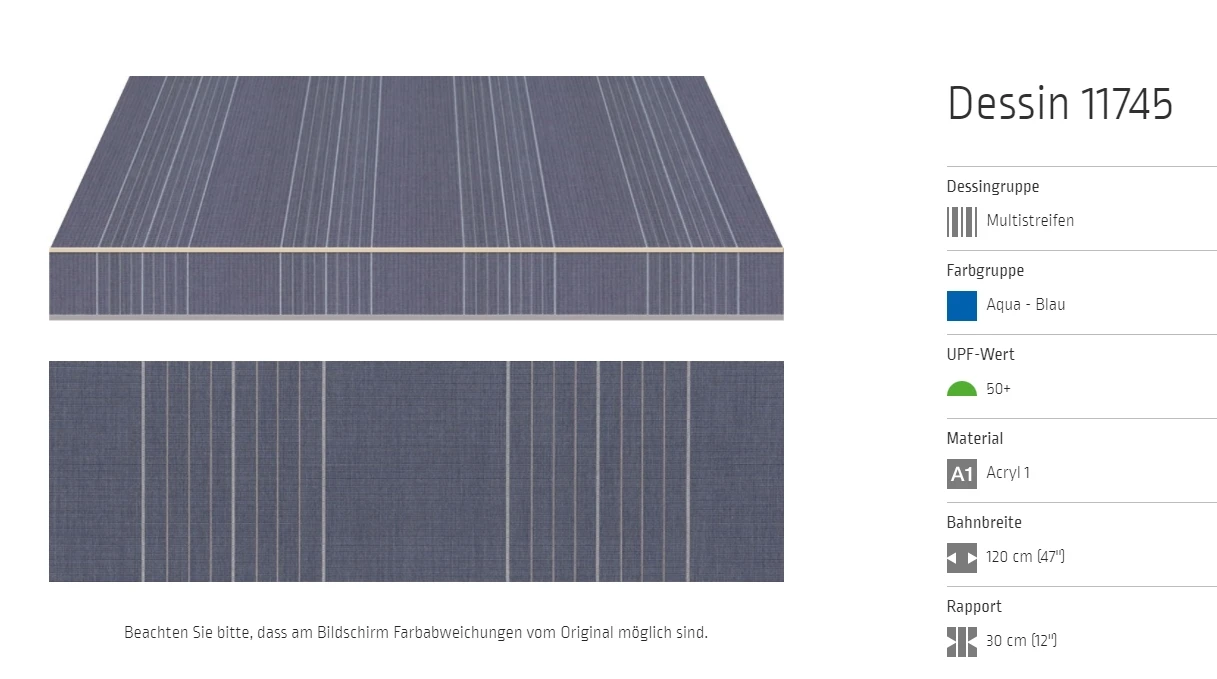 Bei allen Markisenstoffen können Unregelmäßigkeiten in der Oberflächenbeschaffenheit auftreten.