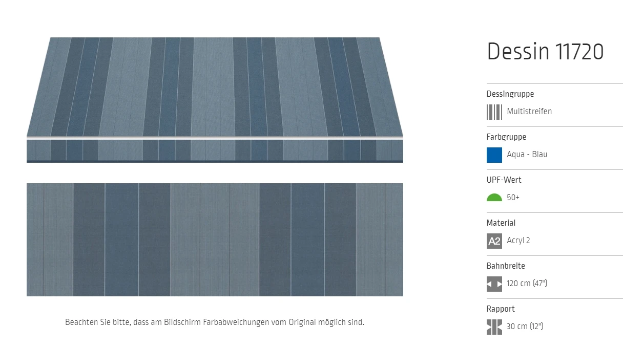 Bei allen Markisenstoffen können Unregelmäßigkeiten in der Oberflächenbeschaffenheit auftreten.