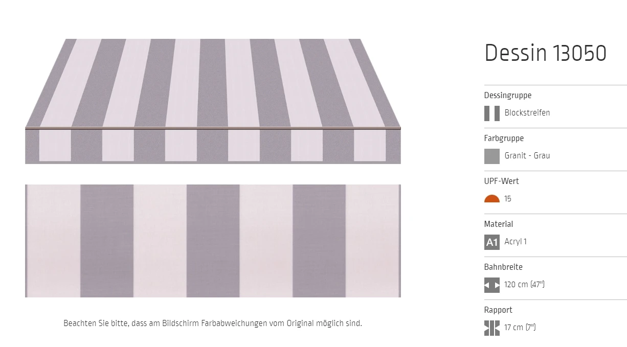 Bei allen Markisenstoffen können Unregelmäßigkeiten in der Oberflächenbeschaffenheit auftreten.