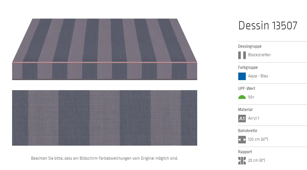 Bei allen Markisenstoffen können Unregelmäßigkeiten in der Oberflächenbeschaffenheit auftreten.