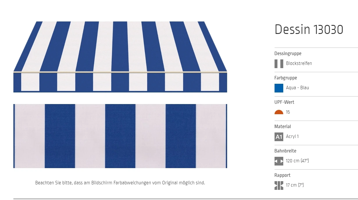 Bei allen Markisenstoffen können Unregelmäßigkeiten in der Oberflächenbeschaffenheit auftreten.