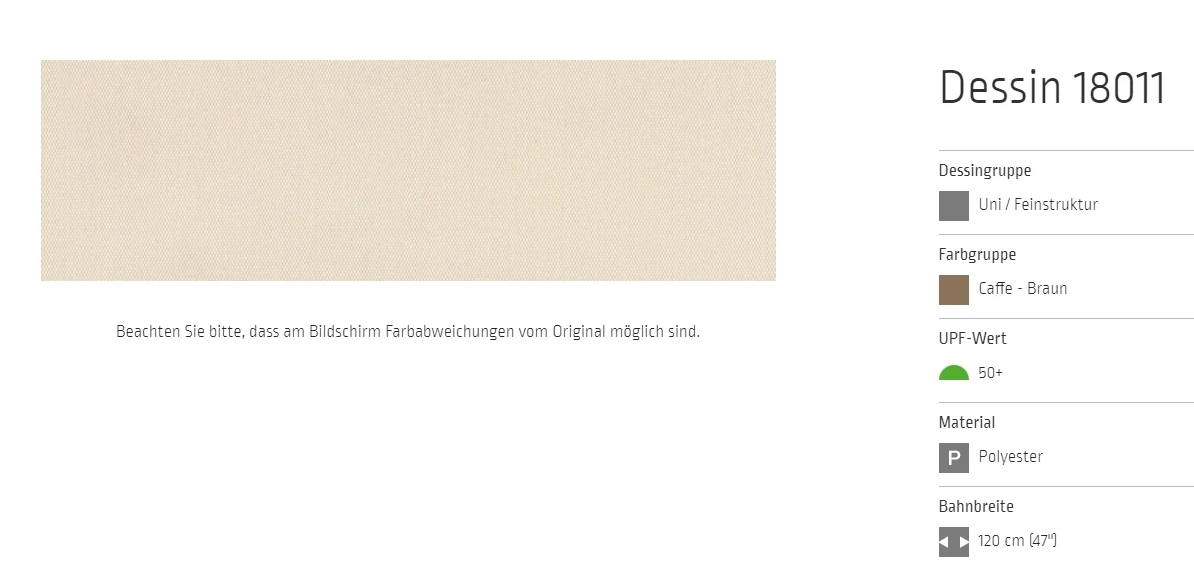 Bei allen Markisenstoffen können Unregelmäßigkeiten in der Oberflächenbeschaffenheit auftreten.