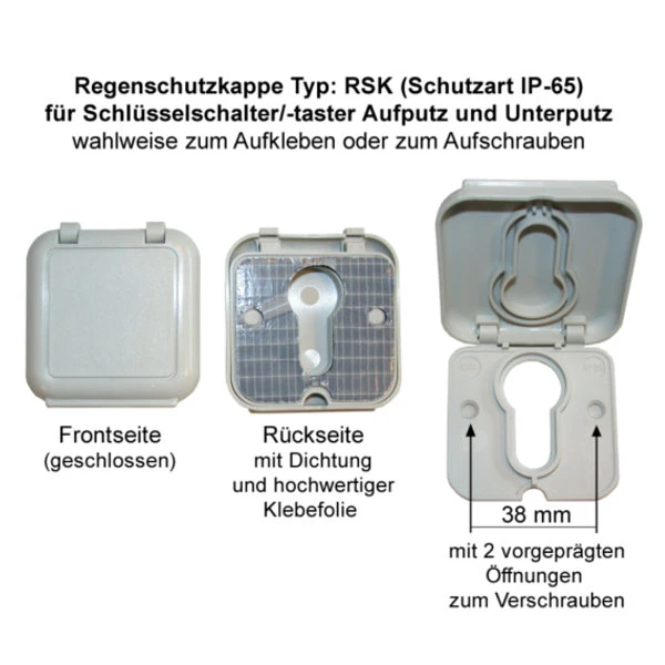 Regenschutzkappe (IP-65), für AP + UP Schlüsselschalter/-taster, mit Profilhalbzylinder, mit rückseitiger Dichtung, mit Kleber zumAufkleben oder zum Aufschrauben